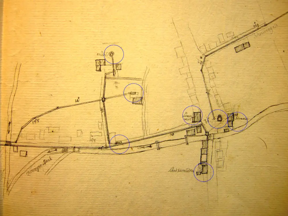 Öffentliche Brunnen im Besitz der Gemeinde sind derjenige an der Rheinfederstrasse sowie der Dorfplatzbrunnen. Dieser wurde durch die Burgenrainquelle gespiesen. Daneben sind die Brunnen bei den beiden Gasthöfen Sonne und Löwen, der Brunnen beim Pfarrhaus, der Mühle und der Statthalterei ersichtlich.